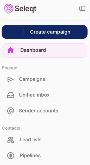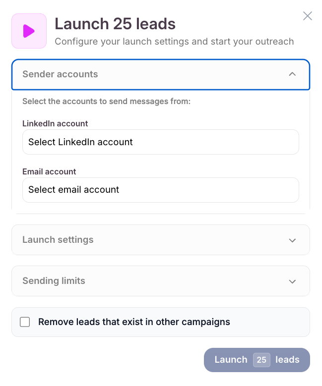 Leads: Add leads to your campaign from our database, through a CSV upload, from an existing lead list, or using multiple LinkedIn import options.