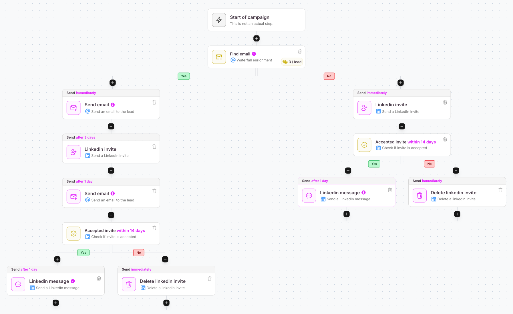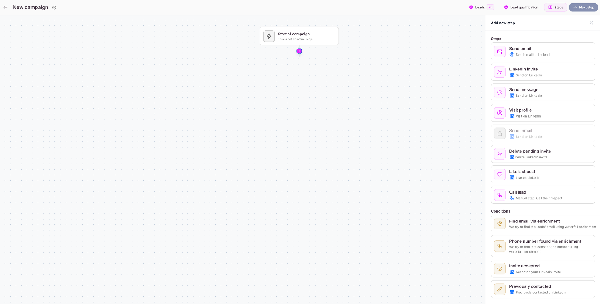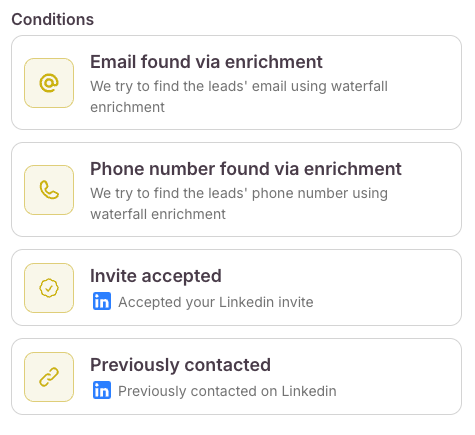 Conditions are triggers for next steps based on the behaviour, actions and information of your lead. By using conditions, you can ensure your outreach is more relevant and effective. These conditions are available in all our plans.