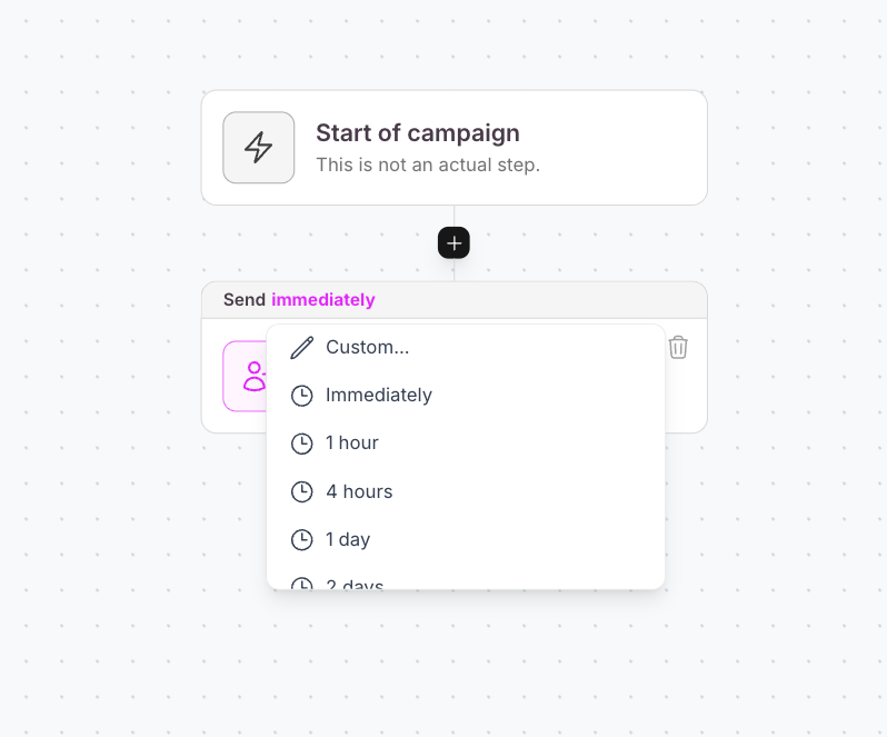 Click on the step you want to set up a delay for. Click on the "Immediately" and set up the preferred delay.