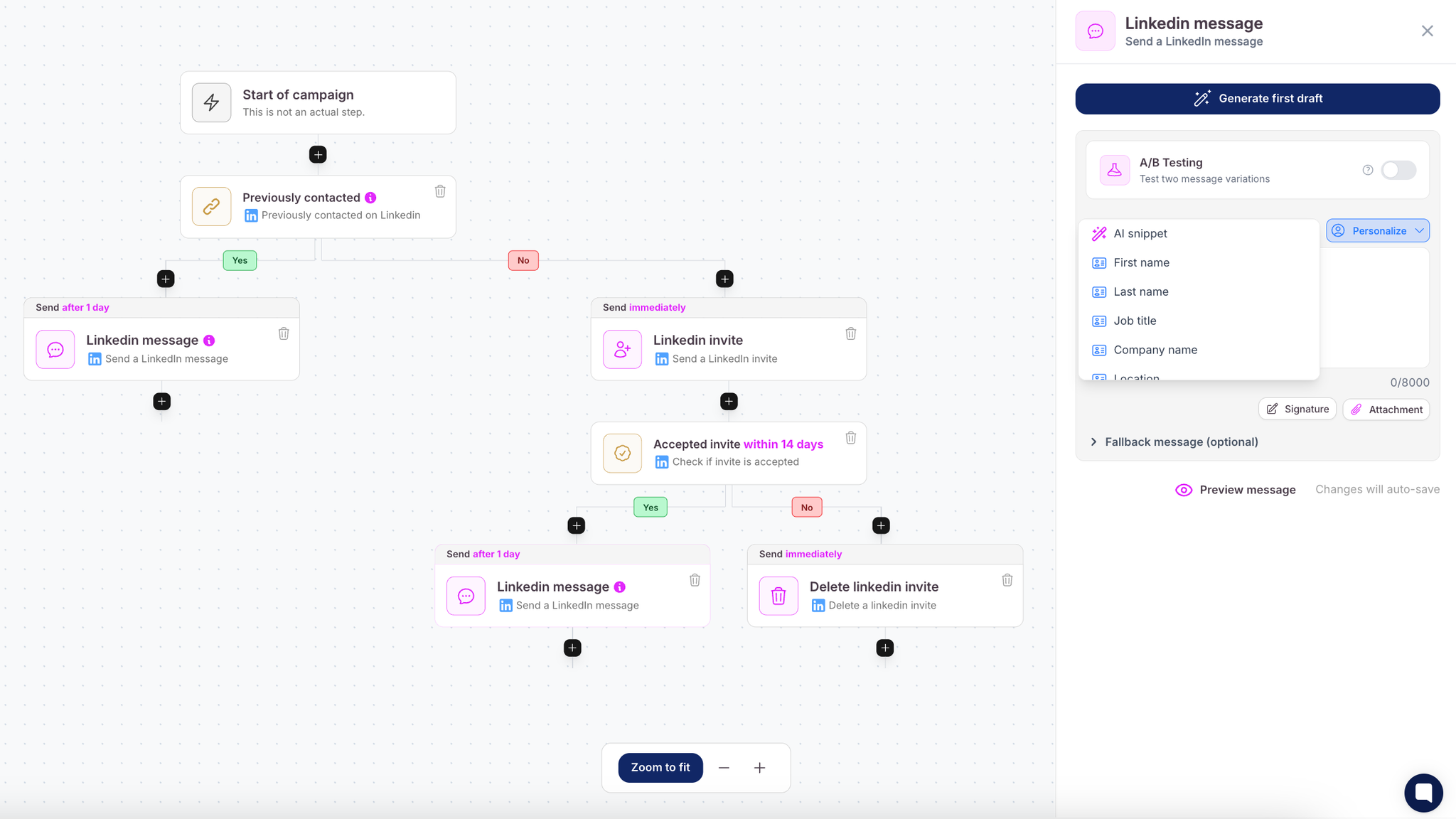 You can also use information found through our AI Research feature, such as details from a lead’s LinkedIn profile, company website, job page, or news mentions to enhance your AI snippets and make your messages even more relevant.