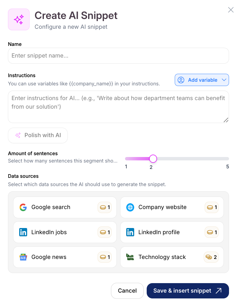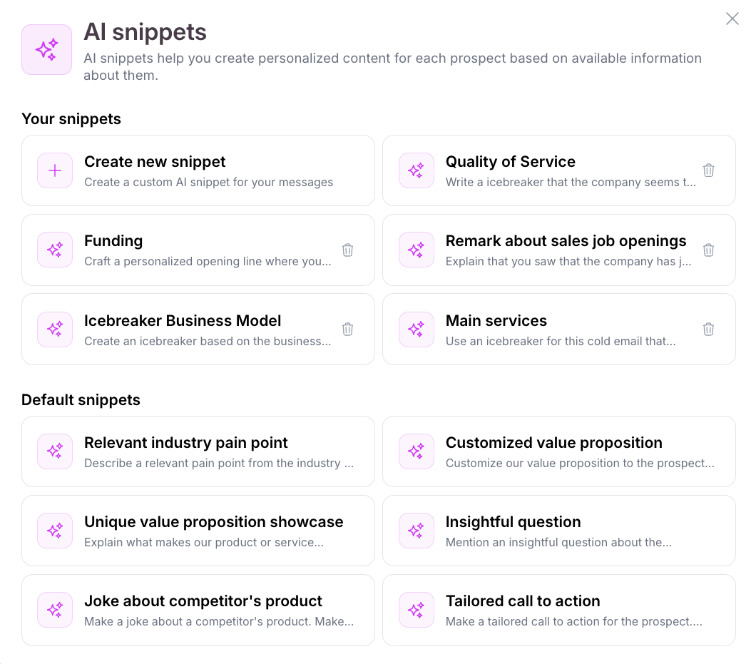 Use AI Snippets to speed up your workflow while keeping your outreach relevant.
