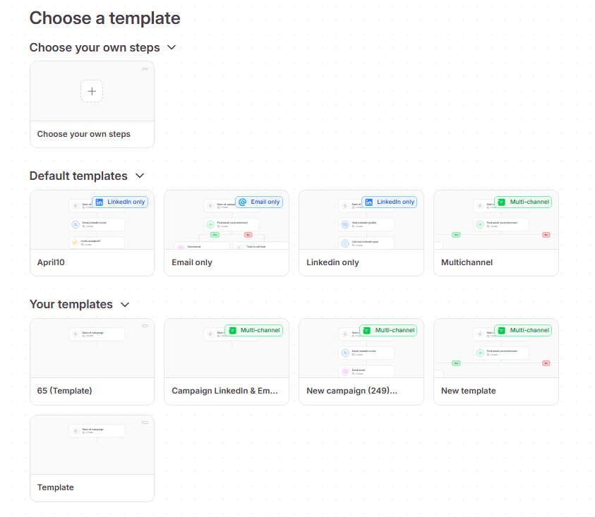 Once your leads are added, you can move past the Lead qualification tab and go straight to the Steps tab. Here, you can choose to build a campaign from scratch or use one of our default templates. For a comprehensive approach, select the Multi-channel template. This will automatically load a complete outreach sequence containing emails, LinkedIn invites, and follow-up messages.