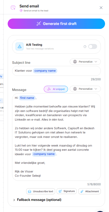 With your template loaded, you will see a visual map of your campaign steps. To customize the content, simply click on any of the communication steps (like "Send email" or "Send LinkedIn message"). This will open a side panel on the right where you can type out your personalized message or use our AI to automatically generate a draft for you.