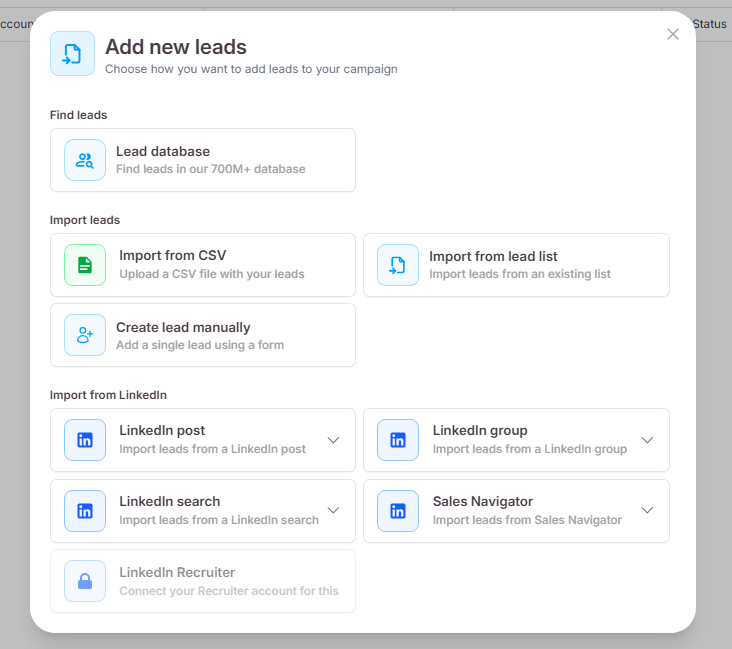 To get started, navigate to the Campaigns tab on the left sidebar and click the + Create new campaign button. You will land on the Leads tab. Click Add new leads to bring in your contacts. You can easily import your leads by uploading a CSV file or by importing them directly from a LinkedIn search.