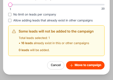 5. Confirm the Move Click the orange Move to campaign button. Your leads will instantly vanish from their current list and appear in their new campaign, ready for the next step in their journey.