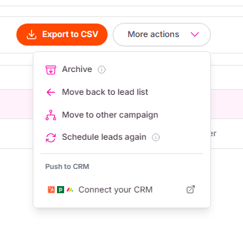 Once your leads are selected, a new menu will appear at the top of your list. Click on More actions and select Move to other campaign from the dropdown list.